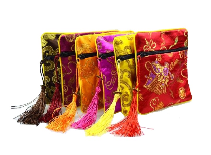 Gorgeous tassel zipper jewelry gift bag. Travel storage high quality silk brocade packaging pouches 5 pcs / lot mix color free.