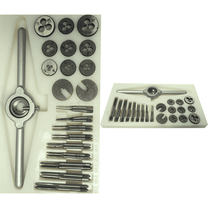 Professional tool for commercial or occasional use. High Speed Steel (HSS) is the best material for tap and dies. If you are cutting loads of new threads or using tap and dies regularly you need HSS. Ideal for model making/watch making or small engineering work. HSS for strength and durability. Metric size taps and dies. Comes in a blow molded tray, for easy storage and transporting. Set includes the ff. 2 x M1 tap – total length – 25mm : 2 x M1.1 tap – total length – 25mm : 2 x M1.2 tap – total length – 28mm : 2 x M1.4 tap – total length – 28mm : 2 x M1.6 tap – total length – 30mm : 2 x M1.8 tap – total length – 30mm : 2 x M2 tap – total length – 35mm : 2 x M2.2 tap – total length – 35mm : 2 x M2.5 tap – total length – 40mm : 9 x DIES – M1 / M1.1 / M1.2 / M1.4 / M1.6 / M1.8 / M2 / M2.2 and M2.5 : 1 x die holder – total length 125mm : 1 x internal die holder / reducer : 2 x tap holders to use in the die holder..