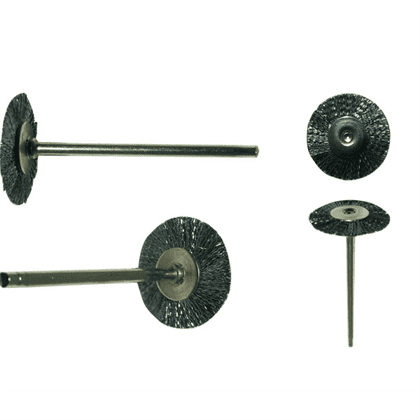 Pendant wheel with numerous fine steel bristles (all the same length). Approx. diameter 21-22mm. Used in conjunction with the pendant motor, hobby drill or micro motor, this wheel is employed to give an even, shiny, satin finish to the surface (either as a finished surface or to give a clean area to which to solder). The wheel must be lubricated with washing-up liquid and water to prevent the brass binding to the surface of the metal. Mounted on a 3/32 shank (fits into collet/chuck of the drill