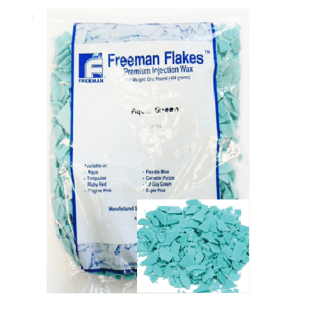 Injection Wax has a low specific gravity (.95) which produces more patterns per pound of wax. Features a low injection temperature with excellent flow even for the finest filigree molds. The rapid solidification of this wax means minimal pattern shrinkage. The wax has excellent flexibility and can be removed easily from molds. Fine memory characteristics eliminate the need to reshape the pattern. Flexibility remains even when the patterns are stored. This wax has a built-in release agent for easy removal from molds. Aqua color. Furnished in flake form. Package 1 lb (454 gr).
