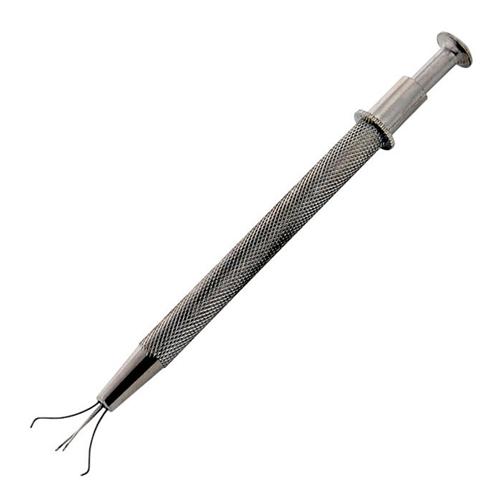 Press on plunger to open the 4 prongs; release to hold small objects securely. Excellent for holding and displaying diamonds and other gemstones. Made of stainless steel and measures 4-1/2? long
