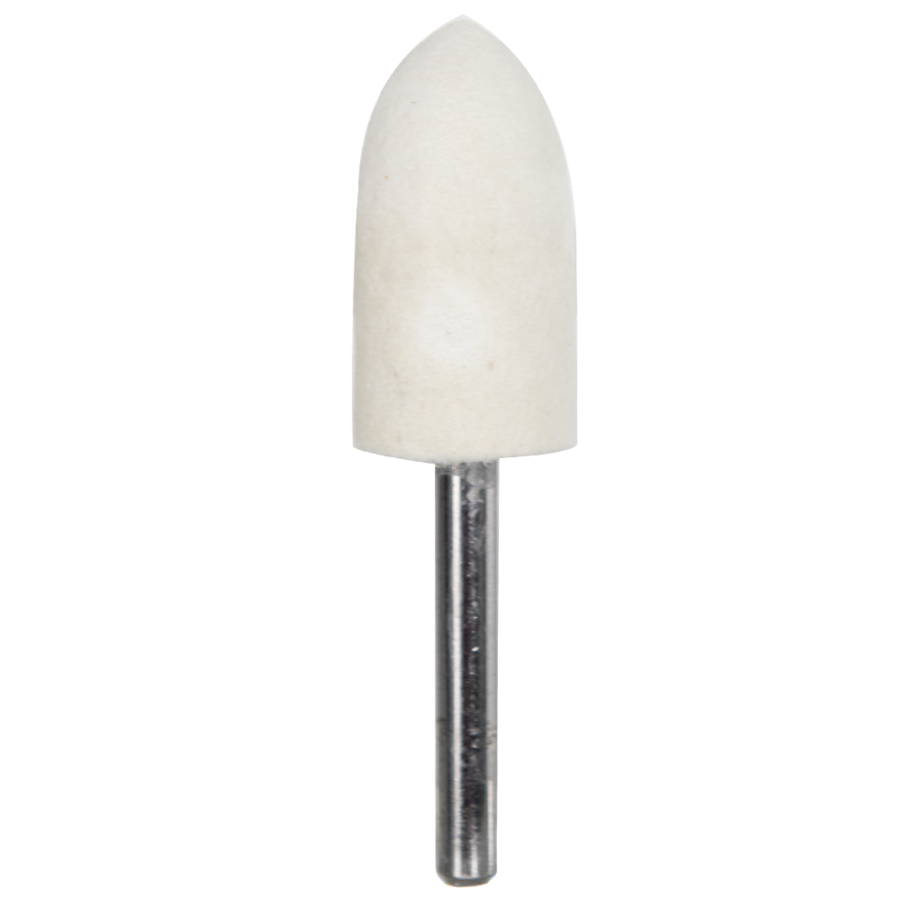 A hard felt pendant point mounted. Rounded cone shape. Used in conjunction with a pendant motor (shank of point fits into collet/chuck of the drill) and employed with a compound.