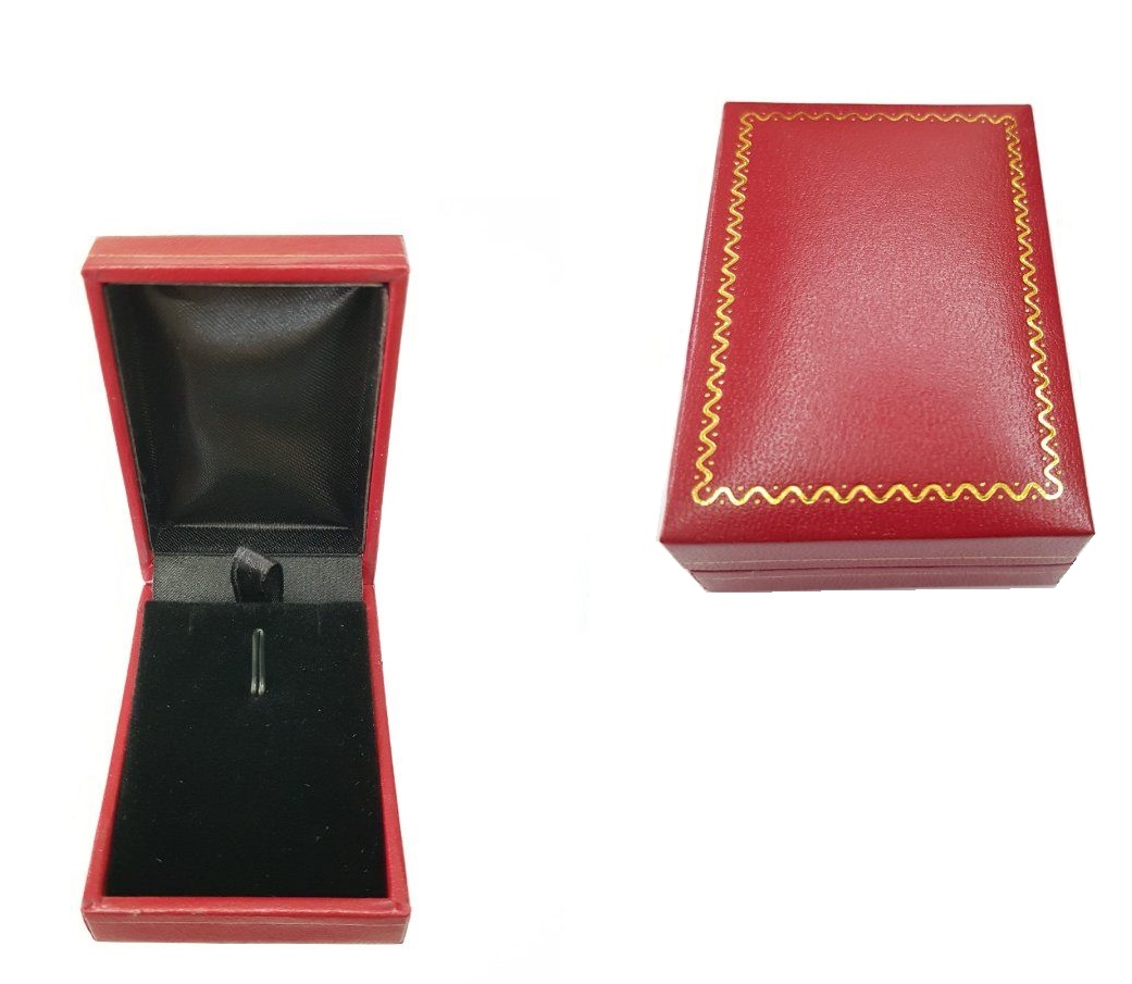 These 4.5×6.5 quality gift boxes are finished in a leatherette type red flock material. The interior of the box has a black flocked foam pad insert with two corner slits for chains/necklaces.