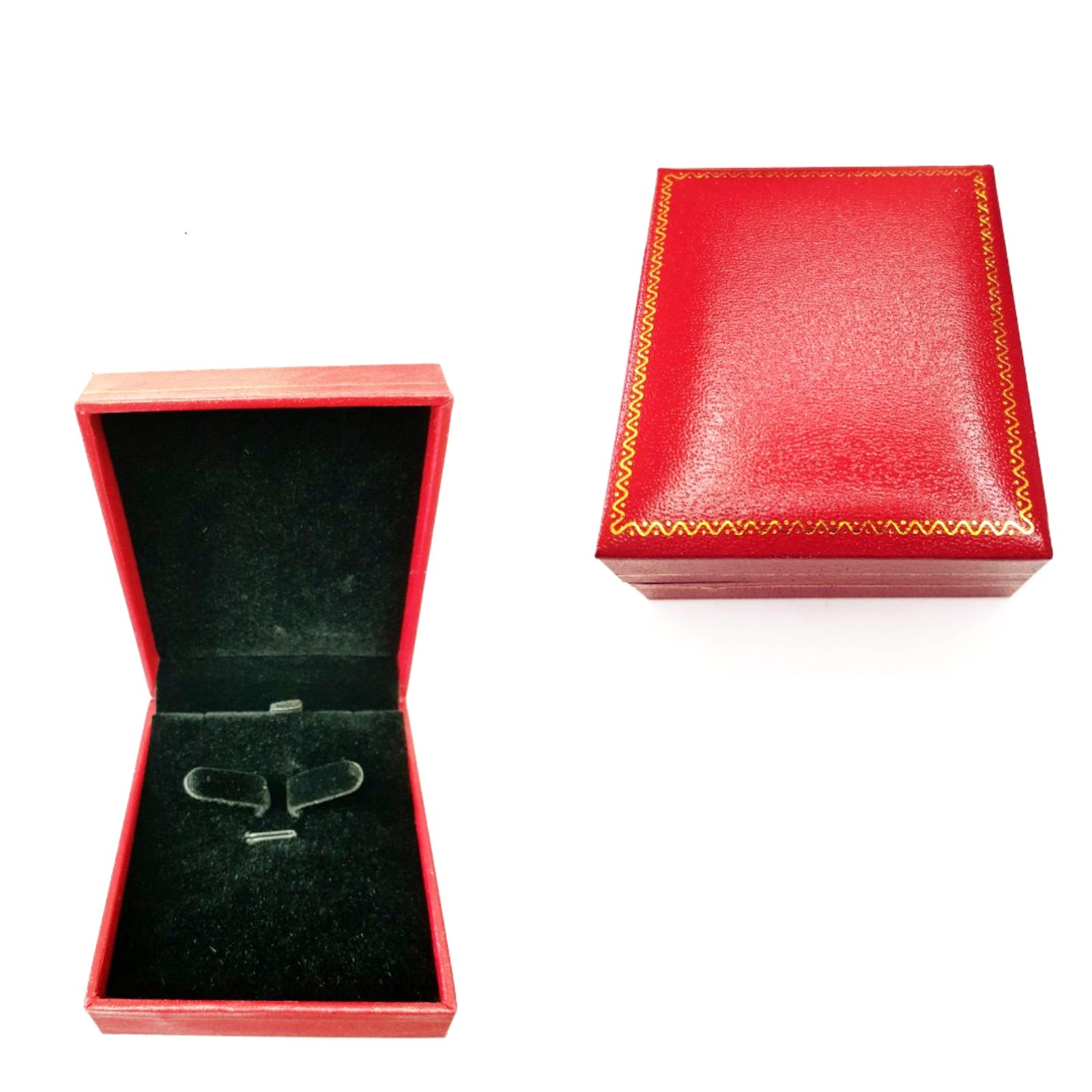A 7×8 red leatherette set jewelry box use for ultimate presentation. A hand-made box with red leatherette exterior, smooth black velvet interior, and gold cartier braided segments on the exterior as a great finishing touch.