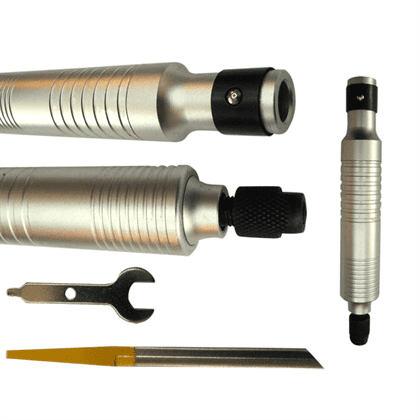 Quick change hand piece #20 allow you to change out accessories (burs, bits, cutters, drills, etc. with 3/32″ or 2.35mm shank) with only a momentary interruption in work and without the use of a chuck key or pin and wrench. A lever mechanism on the handpiece body provides for quick and smooth opening.