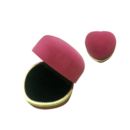 Fuschia heart shaped velvet double ring jewelry gift box. Hinged outer packet for easy removal. A hand-made red velvet heart shaped ring gift box with black soft flocked velour interior.