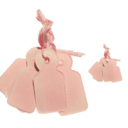 Tag with pink thread isolated on pink background. Use for organizing, labeling or pricing. Made of heavy weight white quality paper. Box of 500 approx.
