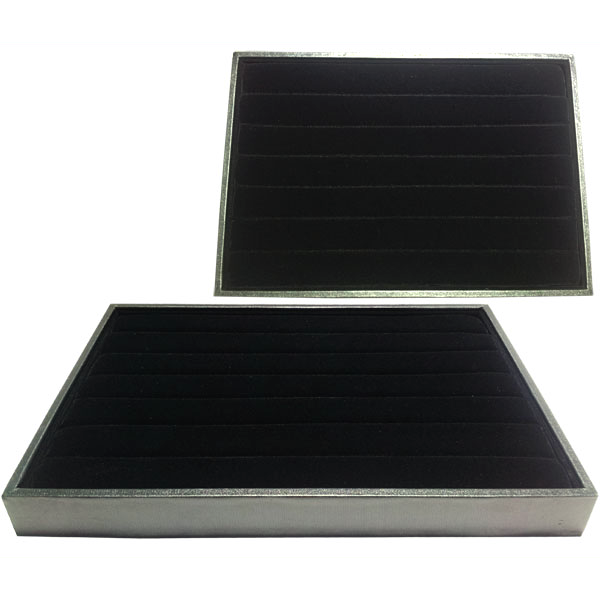 Black velvet ring pad with 7 continous slots. Wooden case is coated with a black leatherette; Handy-size case, measures:27.9*18*3cm