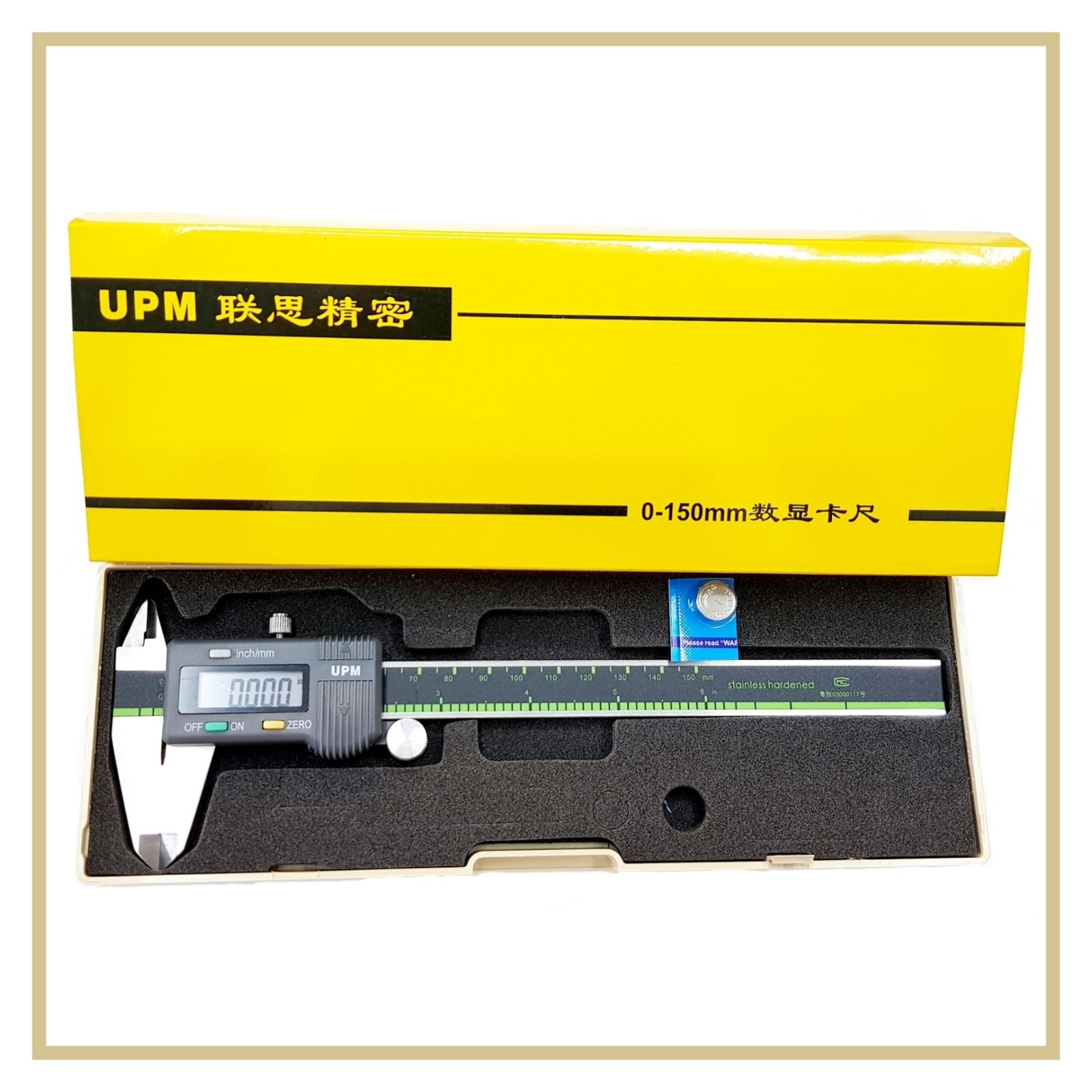Electronic Digital Caliper UPM The electronic digital caliper is measuring range from 0~150mm. The clear reading is in either metric or imperial format on the LCD display. The caliper is zero setting at any position and with locking screw for accuracy. The caliper is stainless and nice built body to reflect professionalism.
